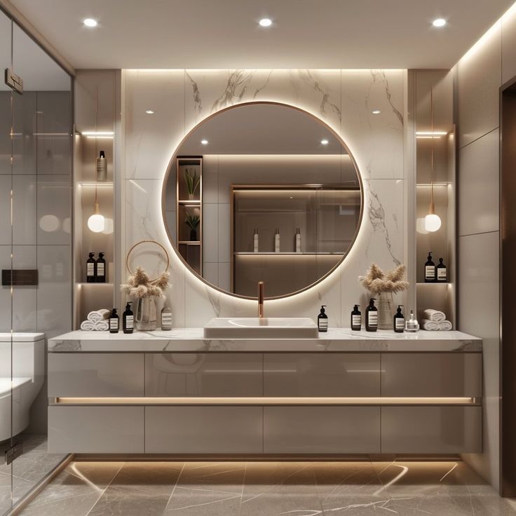 Hệ lưu trữ "Giấu kín" tinh tế: Che đi toàn bộ đường ống nước mất thẩm mỹ, đồng thời cung cấp không gian rộng rãi để sắp xếp mỹ phẩm, khăn tắm phân sản phẩm.